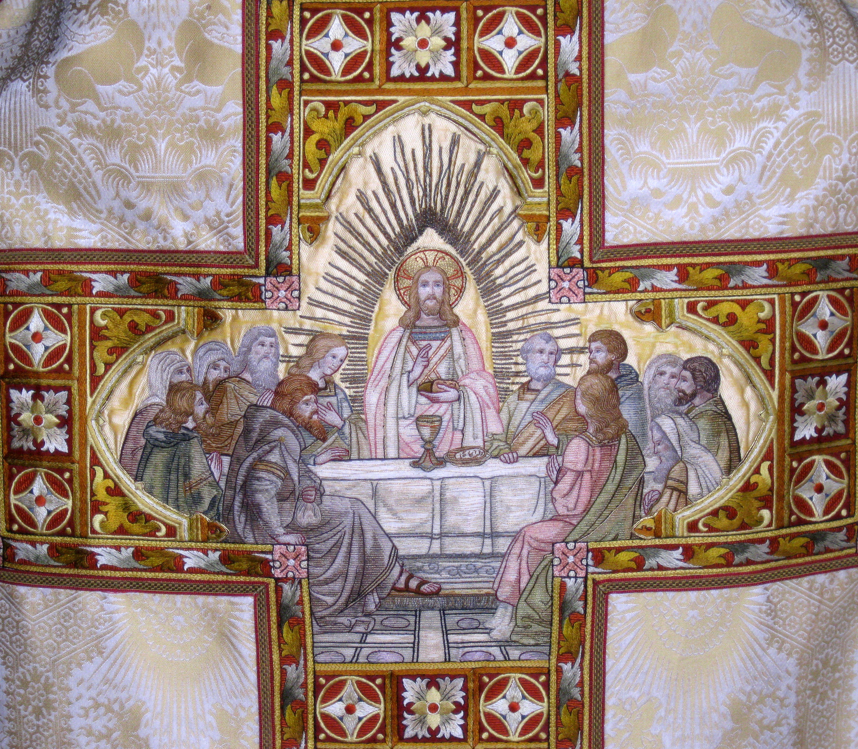 Roll over, Da Vinci!  Not to sound pretentious, but I’ve just discovered another masterwork of the Last Supper.  Apparently from the late 19th century, this one is probably the artistry of an anonymous nun in a Swiss convent, and it wasn’t painted on a wall but embroidered on a liturgical vestment.  Take a look at this baby: