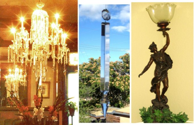 In the middle is one of the Baccarat prisms (about 18 in. long) hanging on my porch. On the right is a lamp (purchased in an antique shop), which is also here in my apartment. By the French sculptor Auguste Moreau, it sat on the newel post of the tiger-eye oak staircase in our grand reception hall. A few shadows of the Victorian elegance of the Four Belles.