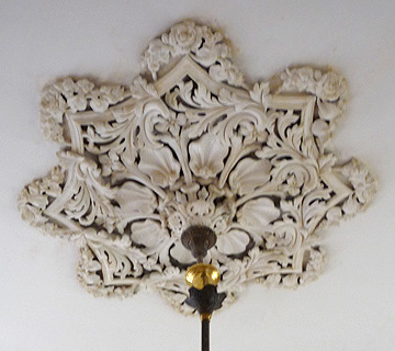 The derelict house was just a few doors down M Street from the one with the mirrors and mantles. I hauled my ladder into its crumbling dining room and proceeded to the cautious work of removing the ceiling medallion. In the middle of the job, the entire ceiling of plaster and lathe let go of the joists. There I was standing at the top of the ladder like Atlas holding up a very heavy sky! With extreme trepidation and caution I tilted the slab to rest one edge on the floor, and with the other side propped on the ladder, I climbed down. Then it was a fairly simple job to remove the prize and haul it away in trusty old Lavenia Van Dodge.