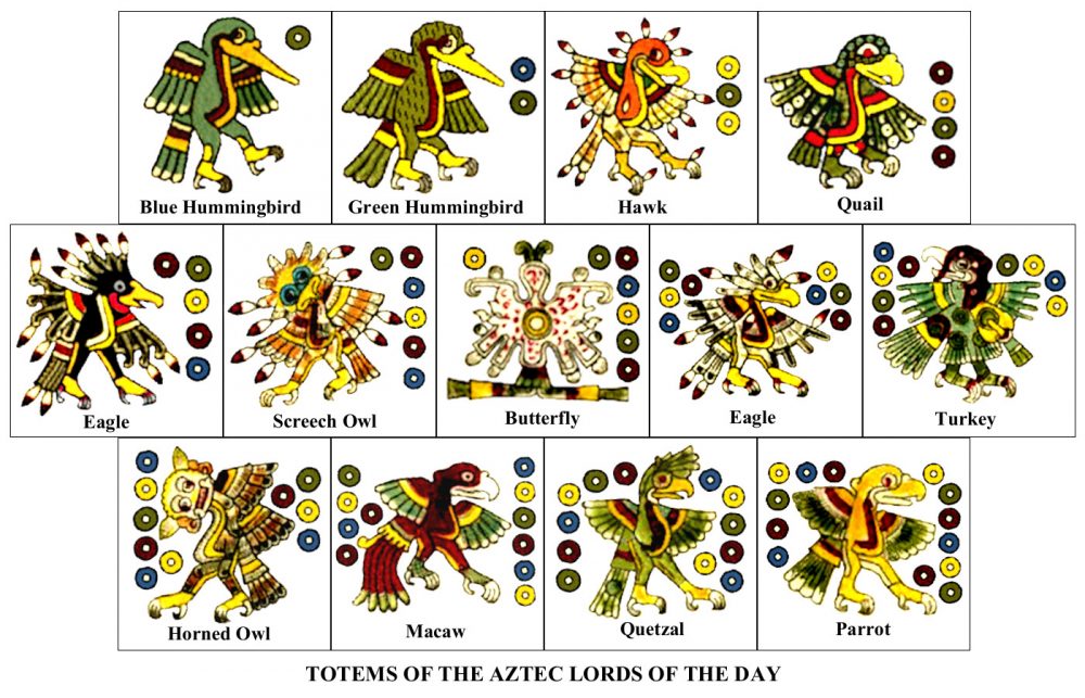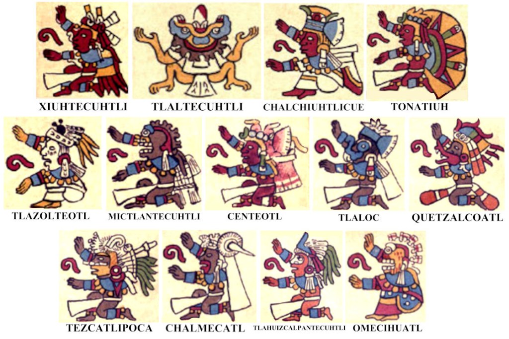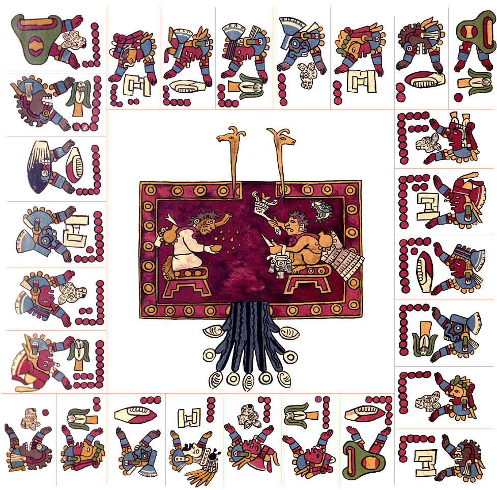 In Codices Borgia and Vaticanus, the 13-day ceremonial week (trecena) is laid out in a complex day-count (tonalpohualli) with a panel presenting its divine ruler(s) or patron(s). In Codex Borbonicus and Tonalamatl Aubin, both the Lords of the Day (with their totem birds) and Lords of the Night are included but aren’t very easy to differentiate/identify. In its spreadsheet-format calendar, Codex Cospi also inserts the Lords of the Night in equally sketchy heads and symbols.