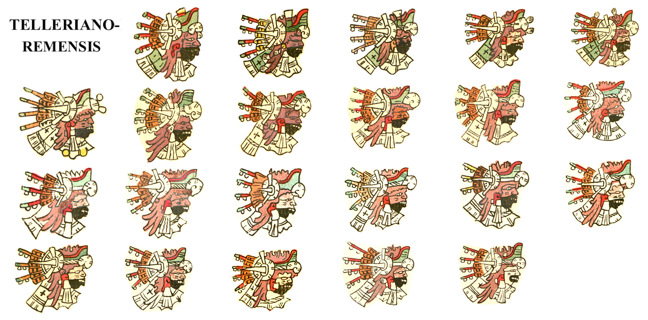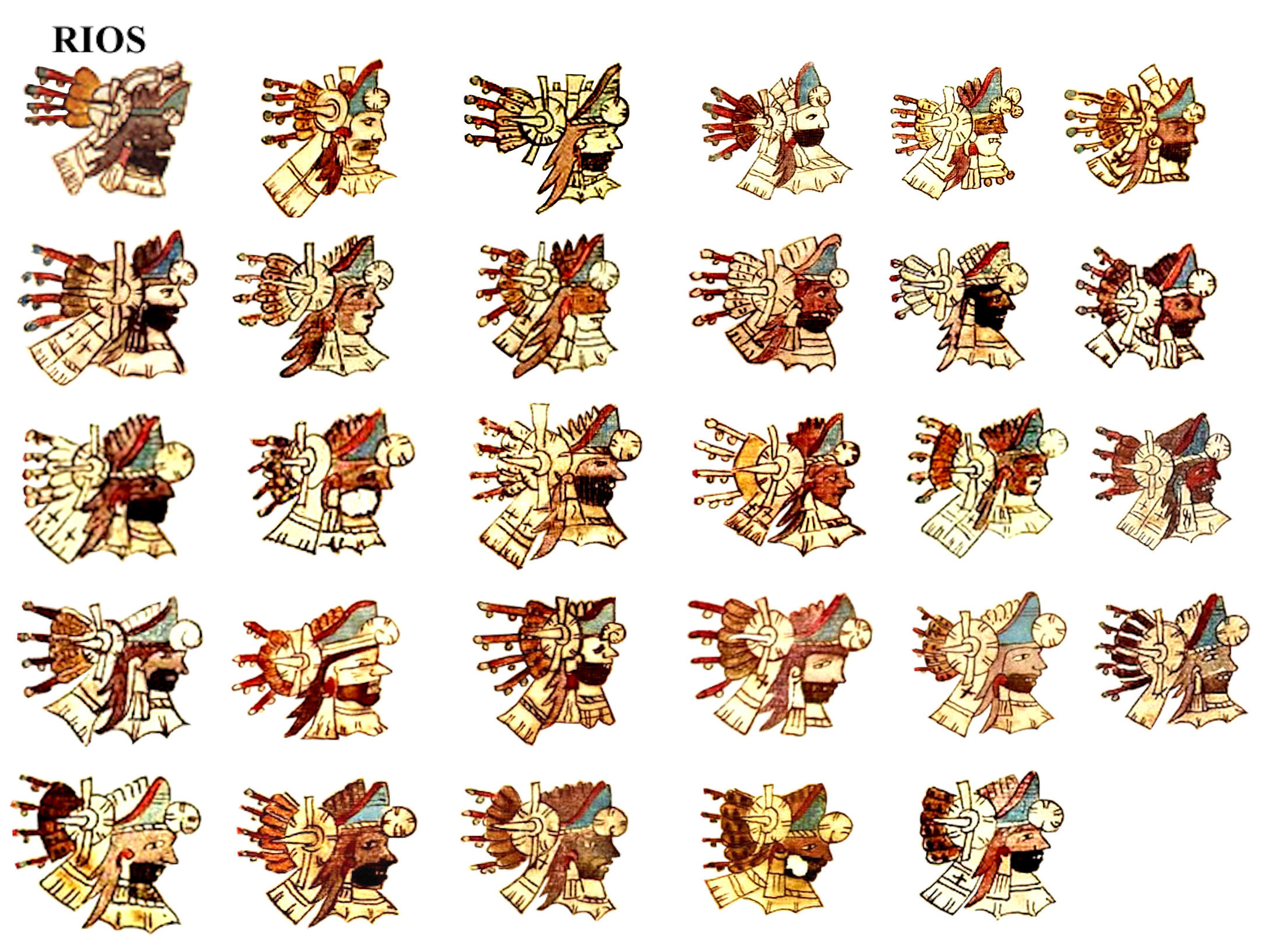The T-R and Rios tonalamatls include the nine Lords of the Night in sequence with the days, a cycle taking many years to complete (9 Lords/260 days). These Lords also appear (very sketchily) in Codex Cospi and in the complicated layouts of Codex Borbonicus and Tonalamatl Aubin along with Lords of the Day and totem birds, but in T-R/Rios the Lords of the Night are shown prominently alone in distinctive portrait busts.