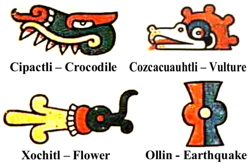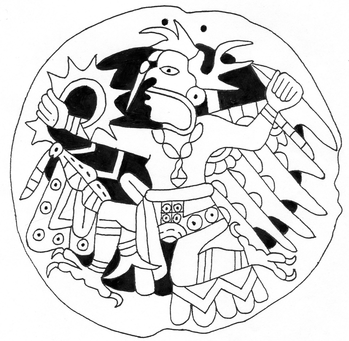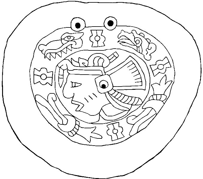 Crocodile is the first day of the 20-day “month,” and Flower is the last. I can’t say why there are two Flowers, but Vulture is the day right before Earthquake. Meanwhile, the four Earthquake signs are particularly eloquent. In “Mexican” cosmology, Four Earthquake is the day-name of the current Fifth Sun (era or world). Thus the head on the gorget is most likely that of the deity of the Fifth Sun, Tonatiuh, familiar as the face in the Aztec Stone of the Suns which is centered in the decorative day-sign of the Fifth Sun.
