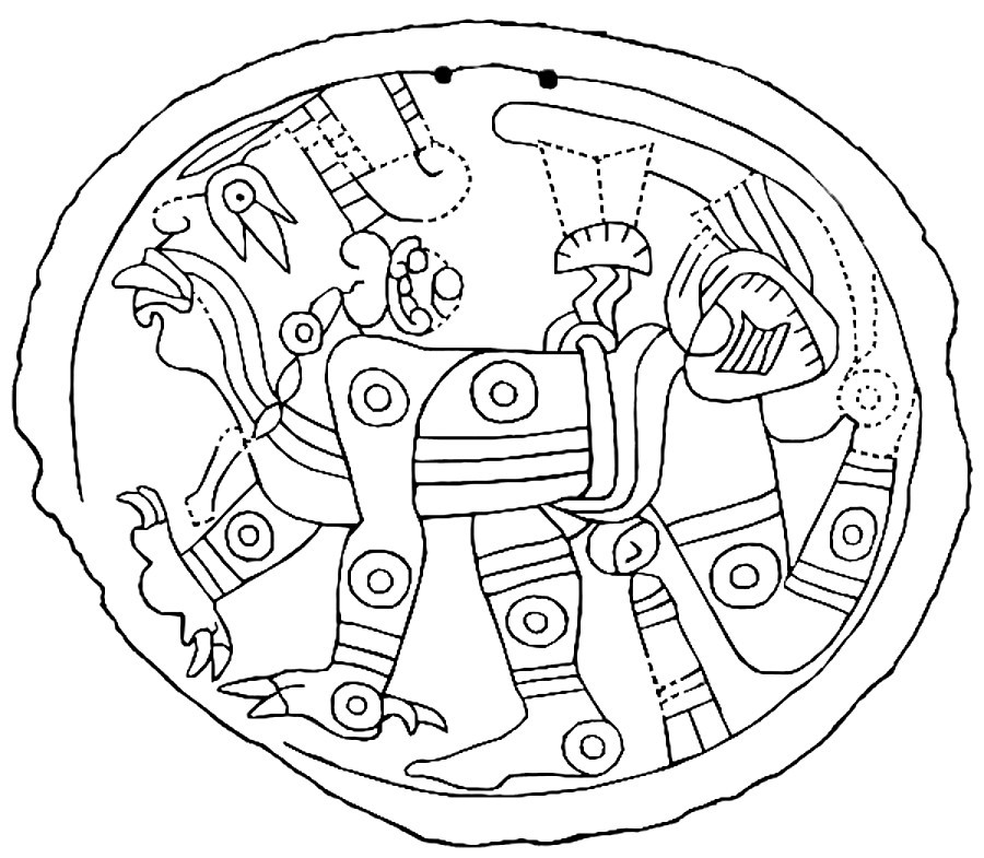 However, still smarting from the academic antagonism directed at my original post, I want to avenge the attack by bringing forth a bit more evidence for Mesoamerican “connections” in the Mississippian area. First, let me note that several other Mississippian shell gorgets also show felines with decorative pelt patterns—surely jaguars, which by then and there must have become purely mythical creatures. A striking example is my (reconstructed) drawing of the Fairfield Gorget from Missouri (an area of many pyramid and platform mounds):