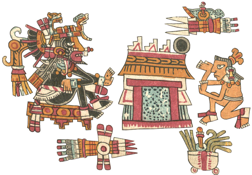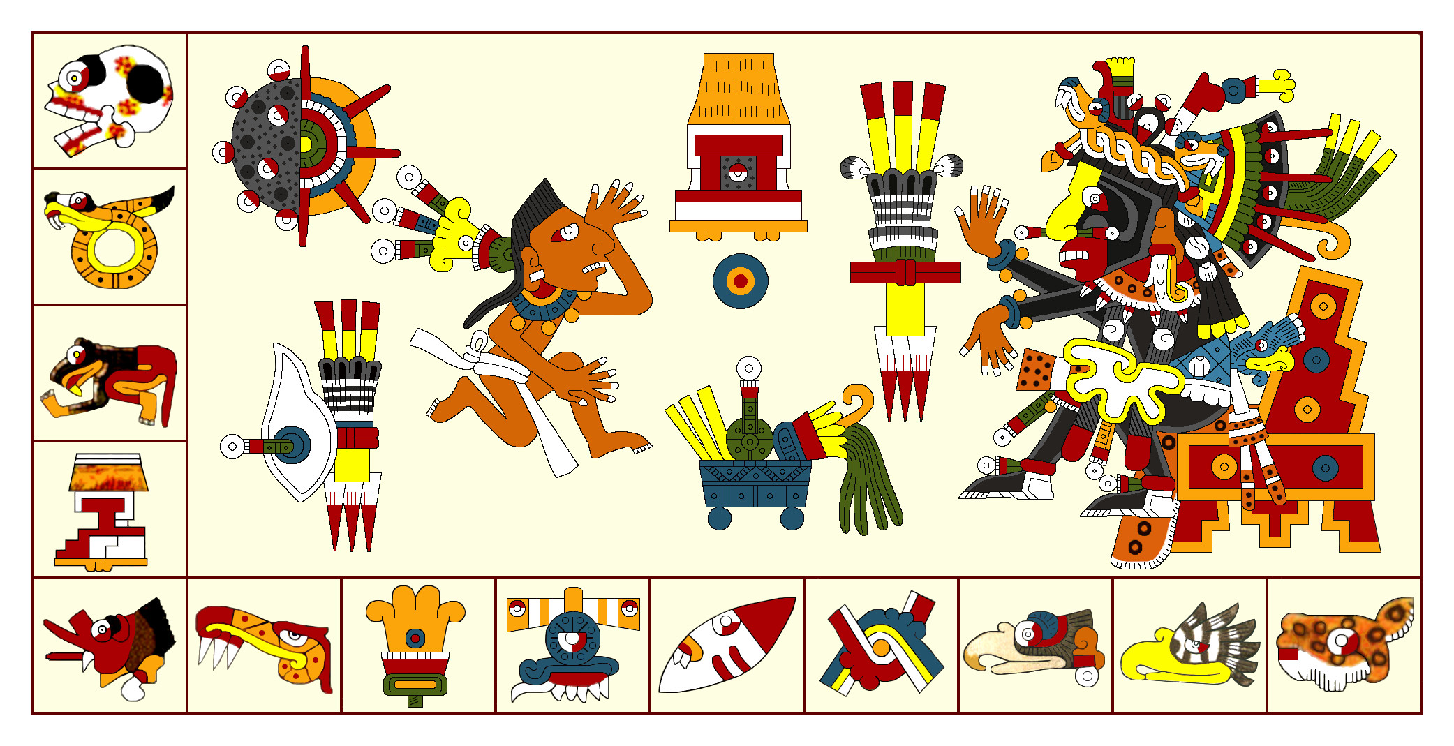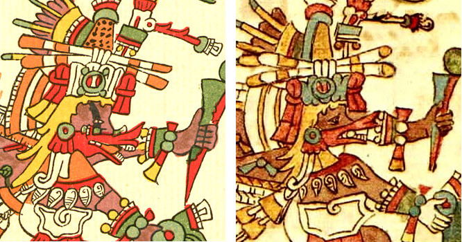 I can’t leave this image of Quetzalcoatl without complaining about his arms—and two left hands. Their connection with the deity’s torso is beyond distorted—almost like two left arms. The choice of how to “excuse” this glaring feature is yours: extreme ideoplasty, artistic ineptitude, or proto-Cubism? (In the original Borgia image, the distinction between his arms is unclear against the god’s black body, but it required only a tiny adjustment of the gray outline to line up the figure’s appropriately right and left hands.)