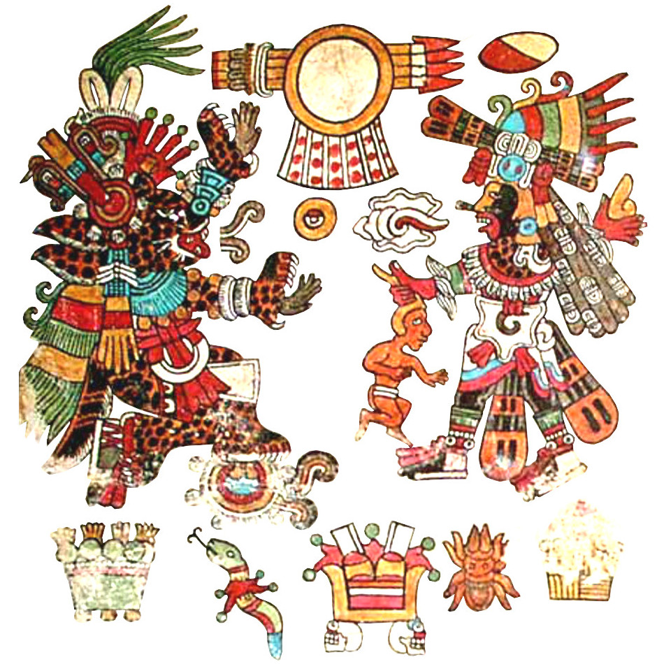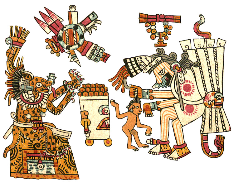 Here Tepeyollotl is again an actual jaguar (oddly with only three claws on his forepaws). Apart from another “power serpent” (clearly a rattlesnake), the central paraphernalia is different than that in Borgia, though the conch is a frequent motif. Quetzalcoatl is recognizable as the secondary patron by his simplified headdress, black face-stripe, stylized conch-shell pendant, and in particular by the cross symbols on his sandals. The item in his right hand isn’t recognizable as a nautilus shell, but the victim held by the hair in his left is consistent iconography—and may also be a child. It’s amusing to note the blue finger- and toe-nails.