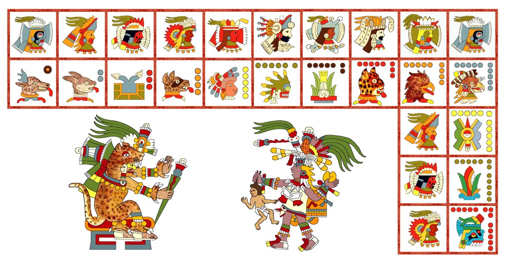 As the incomplete Codex Borbonicus and Tonalamatl Aubin start with the Deer trecena, I can now offer their patron panels for comparison. Apart from the differing secondary patrons and graphic styles, they’re remarkably consistent theologically.