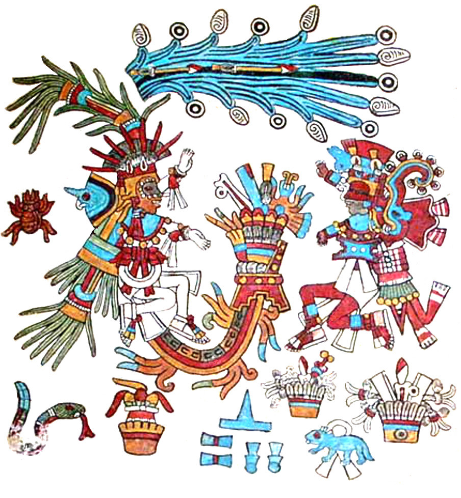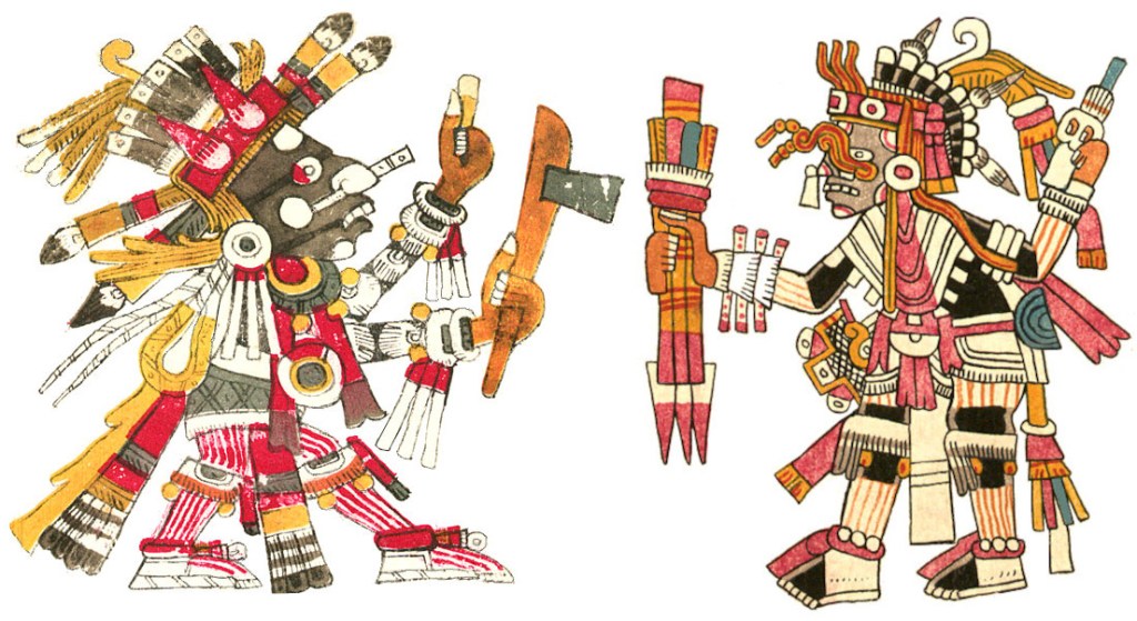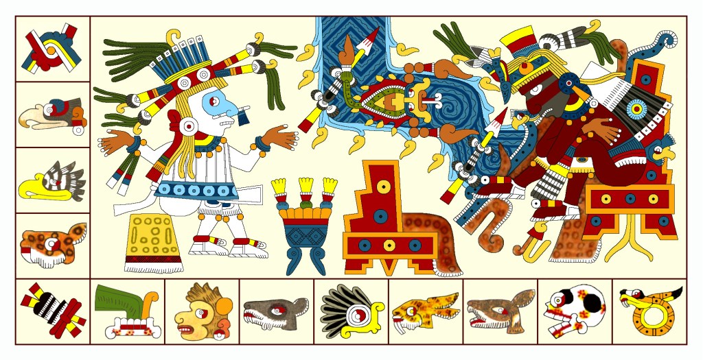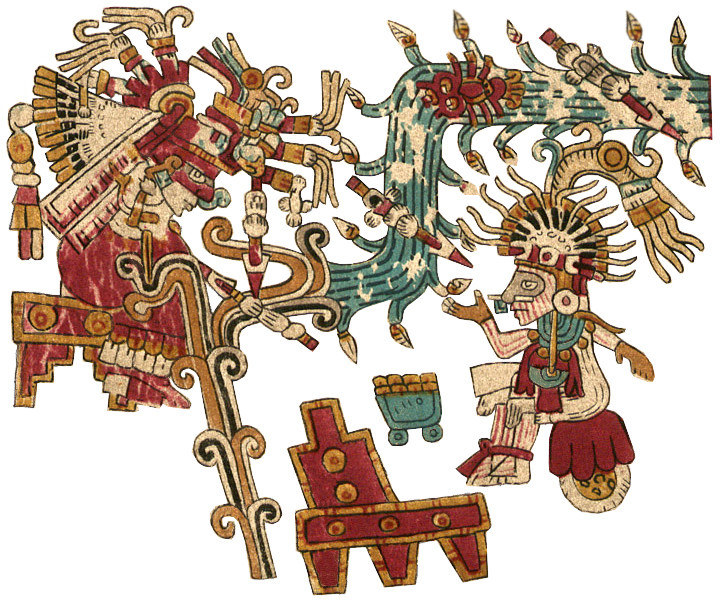 The flayed Tlahuizcalpantecuhtli is the main evidence I see of Dr. Paquin’s ancient Maya themes for this trecena of fertility, emergence, and liberation. Xiuhtecuhtli’s divinatory significance for authority, justice, and higher knowledge is nebulous. And my tentative readings have little to do with any Maya themes. After the several intervening centuries, I wouldn’t be surprised if the later Aztec iteration of this trecena’s themes might be substantially different than the Maya. Perhaps now it’s about confrontation, ambition, and power. After all, the Snake’s all about power, One Snake’s a great day for a war, and Tlahuizcalpantecuhtli is well known as a very aggressive deity, a holy terror. Maybe Xiuhtecuhtli represents the unified center of reality, and the bellicose Morning Star represents the antithetical force of chaos and anarchy, another elemental dichotomy like water and fire. Maybe not…