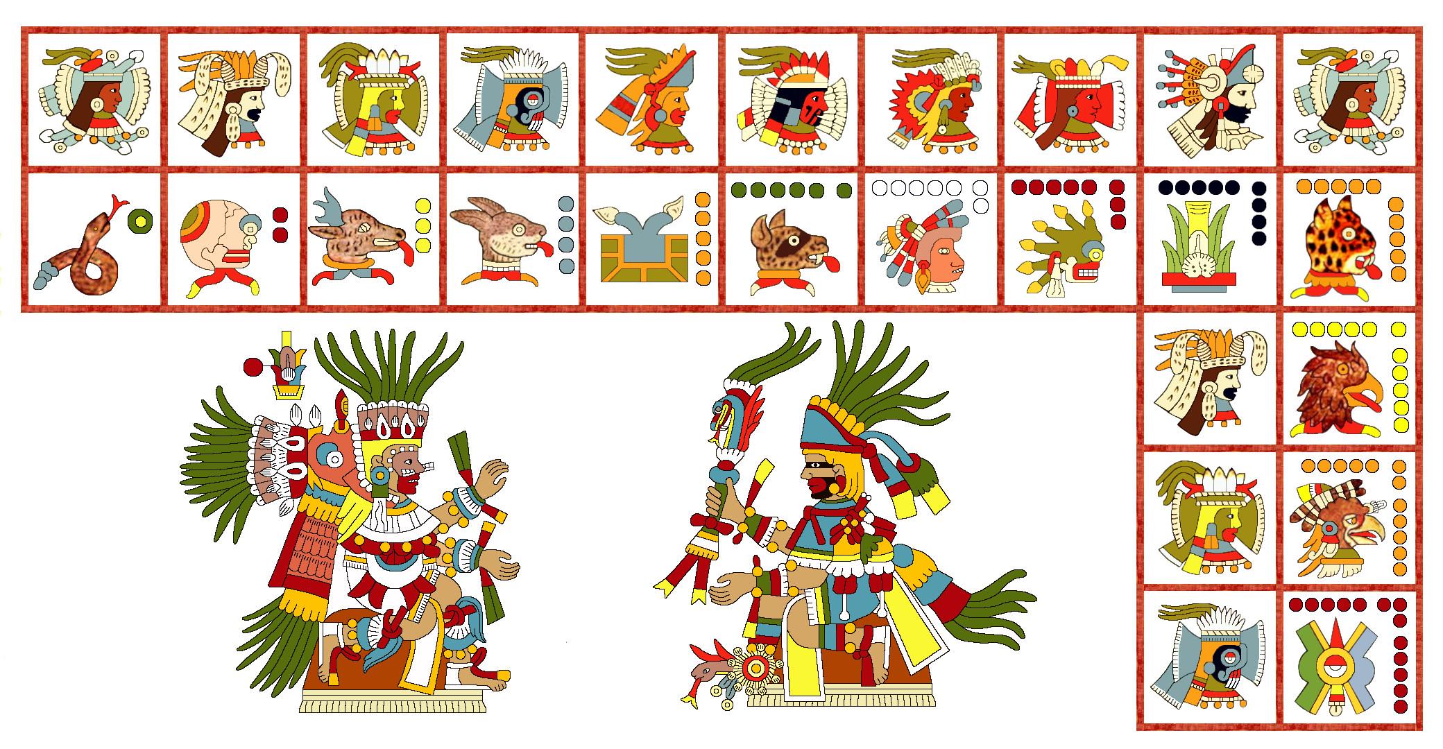 On the right, Xiuhtecuhtli also “dances” or sits on a place symbol and wears ornate regalia. His headdress is very like that on his bust as Night-Lord (fifth from the left in the top row). The Telleriano-Remensis page with his image is missing, and I’ve had to base this representation on the uninspired Rios copy, supplementing it with details from elsewhere in T-R—like the fiery Xiuhcoatl he wields in his raised right hand. In his image in both T-R and Rios for the Pachtontli (Teotleco) solar vientena, Xiuhtecuhtli wears a flaming serpent on his back, but I thought that would be a little too much here. However, in both of those images one of his feet is the mystical water-fire symbol (atl-tlachinolli), which I’ve inserted as the Fire Lord’s right foot. Note his red and black face-paint as in the Borgia version—and in the following examples.