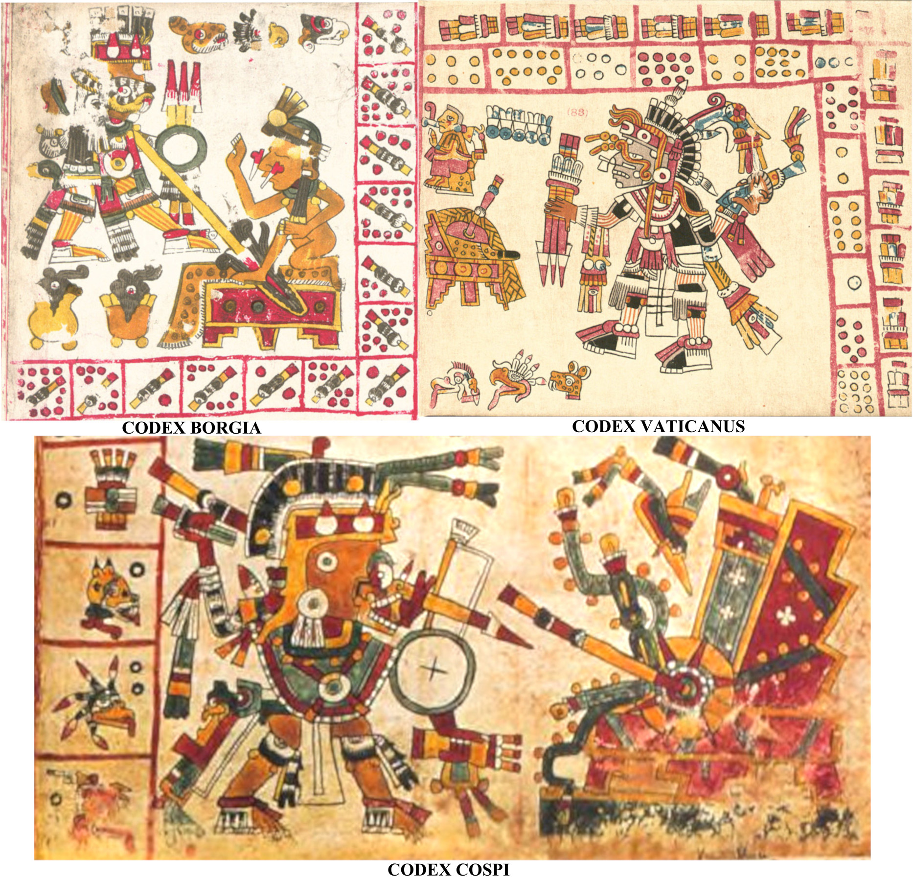 Considering his victims confuses things. In the Borgia Crocodile set, he attacks Chalchiuhtlicue, in Vaticanus some male god (maybe Xochipilli), and in Cospi Centeotl. In the Snake set, the Borgia victim is Tezcatlipoca, and in Vaticanus and Cospi Chalchiuhtlicue. In the Water set, in Borgia he attacks Centeotl, but in Vaticanus and Cospi the throne of a water deity (Tlaloc?). In all the Reed sets, he attacks the throne of some deity, and in the Earthquake set, he strikes a military symbol in Borgia and the divine jaguar of rulership in the others.