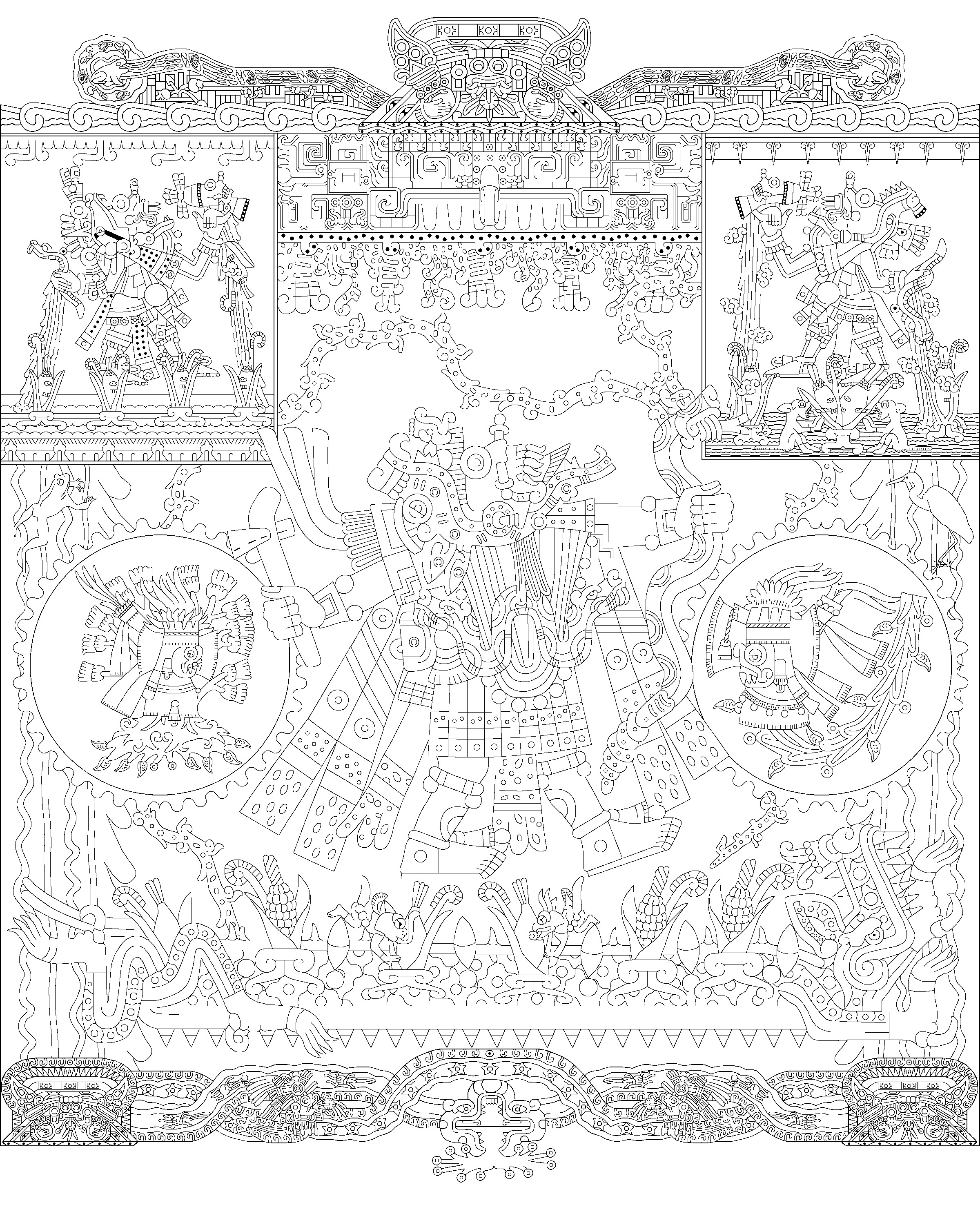 THE AZTEC ICONS are a collection of black and white images of selected Aztec deities designed for coloring (by the serious colorist, young or old). Each is accompanied by a page with caption and model images from the Aztec Codices which may also serve as an authentic coloring-guide. Currently, there are 19 icons, which took about seven years to complete, and I hope to live long enough to create the rest of the planned 26.