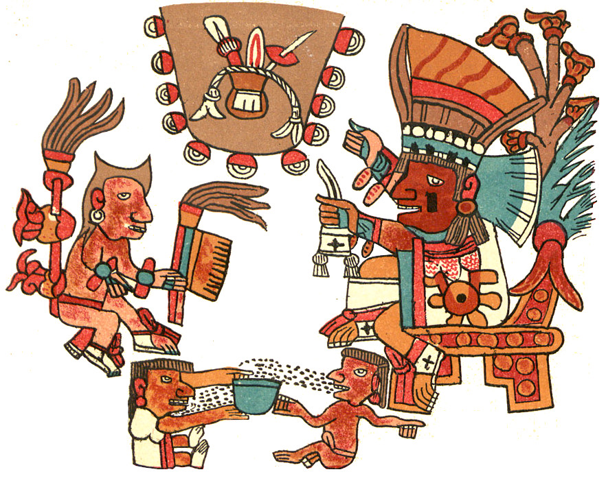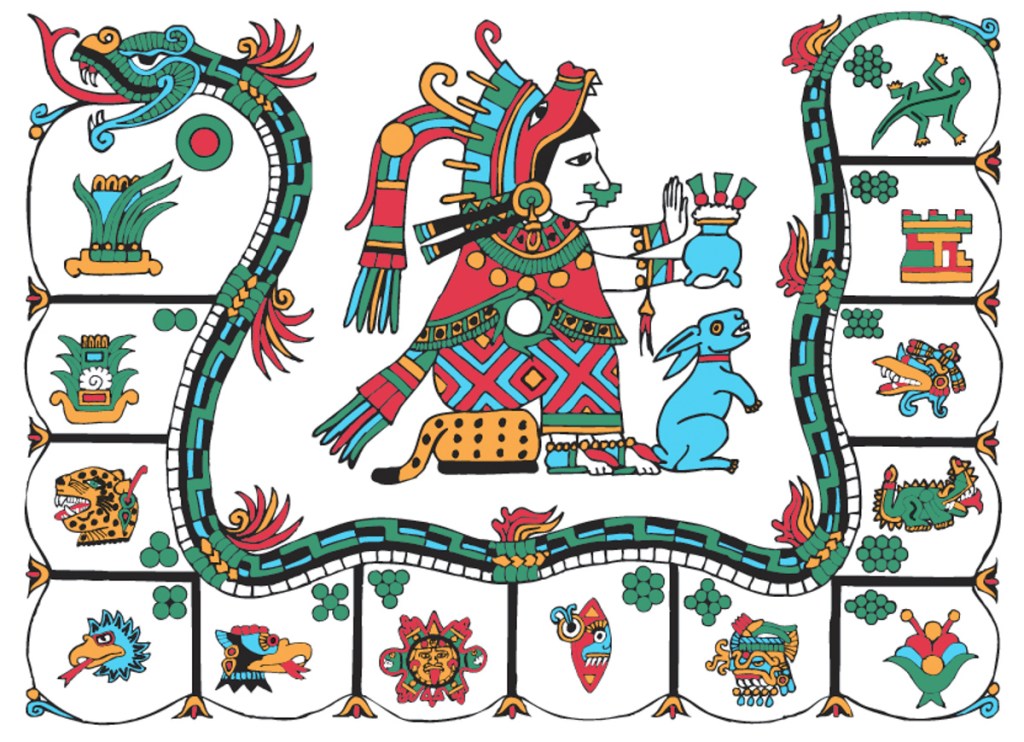 As far as patrons of the Eagle trecena go, these various naguals of Tezcatlipoca don’t seem to contribute much to the trecena’s themes of Supremacy/War and Lofty Vision. Maybe Ixtlilton and the jeweled beast really were included merely to reflect Xochiquetzal’s romantic history with Tezcatlipoca. After all, that would tie in well with her divine sexuality and beauty. Dr. Paquin also suggests that Ixtlilton/Tlaltetecuin (and the jeweled beasts) are acting as cheerleaders for Xochiquetzal, dancing to ward off harmful influences and maintain her high position of supreme strategist in oversight of the game of life-death-resurrection.
