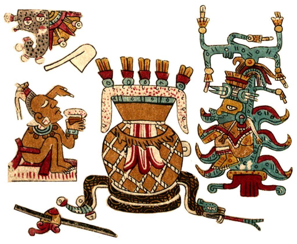At first, I was confused by the lack of emblems specific to Tezcatlipoca on the figure on the right—other than the black body and smoky curls around his eye. Then a knowledgeable friend advised that this was in fact a nagual of the otherwise invisible Tezcatlipoca, Ixtlilton (Small Black Face), also known as Tlaltetecuin (Lord of the Black Water Tlilatl). The symbolic item at top center is his scrying bowl or jar of dark water used for hydromancy, diagnosing ailments and prescribing cures. A gentle god of medicine and healing specifically in relation to children, Ixtlilton brought them peaceful sleep at night. Like Tezcatlipoca, Ixtlilton was a deity of divination, Tezcatlipoca consulting his obsidian mirror, and Ixtlilton studying reflections in dark water. He was also a god of dance and music sometimes called the brother of Five Flower (a nagual of Xochipilli)
