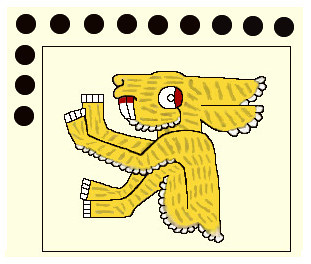 Some scholars suggest that this is a coyote—reflecting Tezcatlipoca’s talent for shape-shifting—like his walk-on appearance as a vulture in the Earthquake trecena. However, while this head might be canine, the ears are totally wrong, as are its eagle talons/claws and feline tail. Then there are those blue things stuck all over it (chips of turquoise or lapis?) which turn it into some mythical jeweled creature. Of course, such scholarly suggestions (like most scholarship) are simply authoritative guesswork, and I don’t require final answers to mysteries.