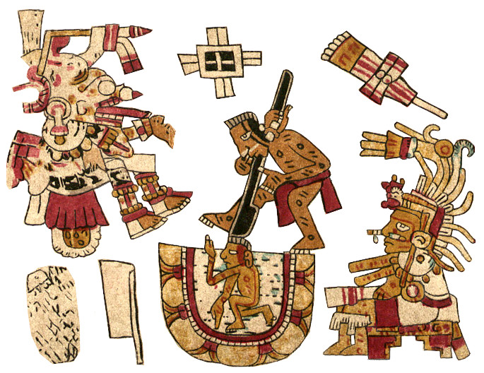 The square would seem to be another patolli board, and the ballcourt design in the upper left is a new emblem, reflecting Xochiquetzal’s additional patronage (along with Xochipilli’s) of the sacred ballgame tlachtli. The decapitated individual may indicate the traditional fate of losers at tlachtli. (I’m not aware of her predilection for that style of sacrifice otherwise. However, somewhere long ago I read of a ritual sacrifice to her of a female, the victim’s flayed skin being donned by her priestess. Oh, my, the wild and crazy things goddesses do in the privacy of their temples…)