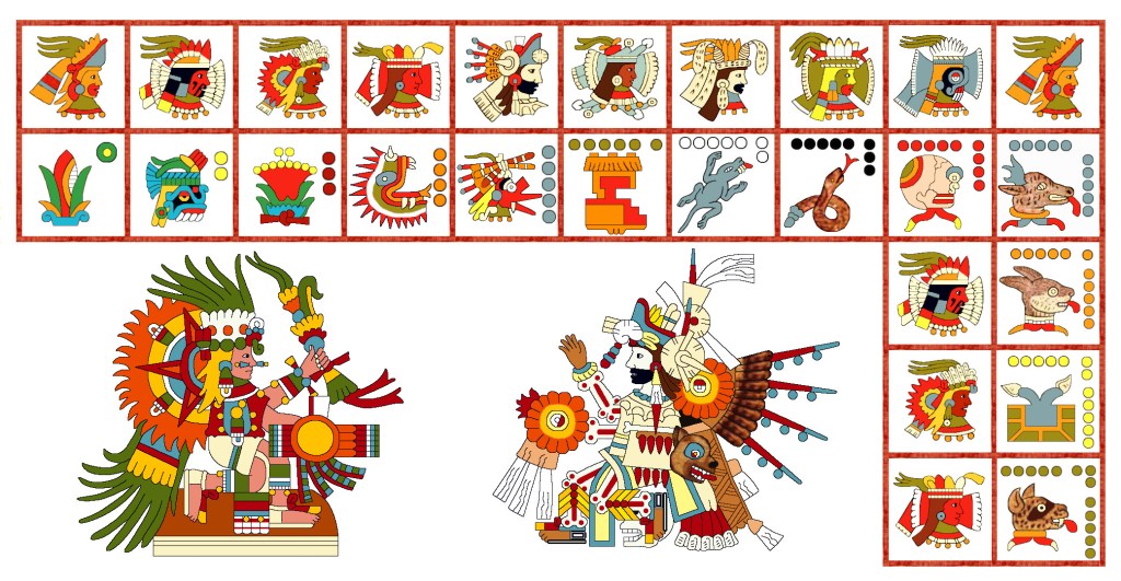 The Aztec Tonalpohualli, like the ancestral Maya calendar, is counted through the sequence of 20 named days of the agricultural “month” (veintena), of which there are 18 in the solar year. Starting with 1 Eagle, it continues with: 2 Vulture, 3 Earthquake, 4 Flint, 5 Rain, 6 Flower, 7 Crocodile, 8 Wind, 9 House, 10 Lizard, 11 Snake, 12 Death, and 13 Deer.