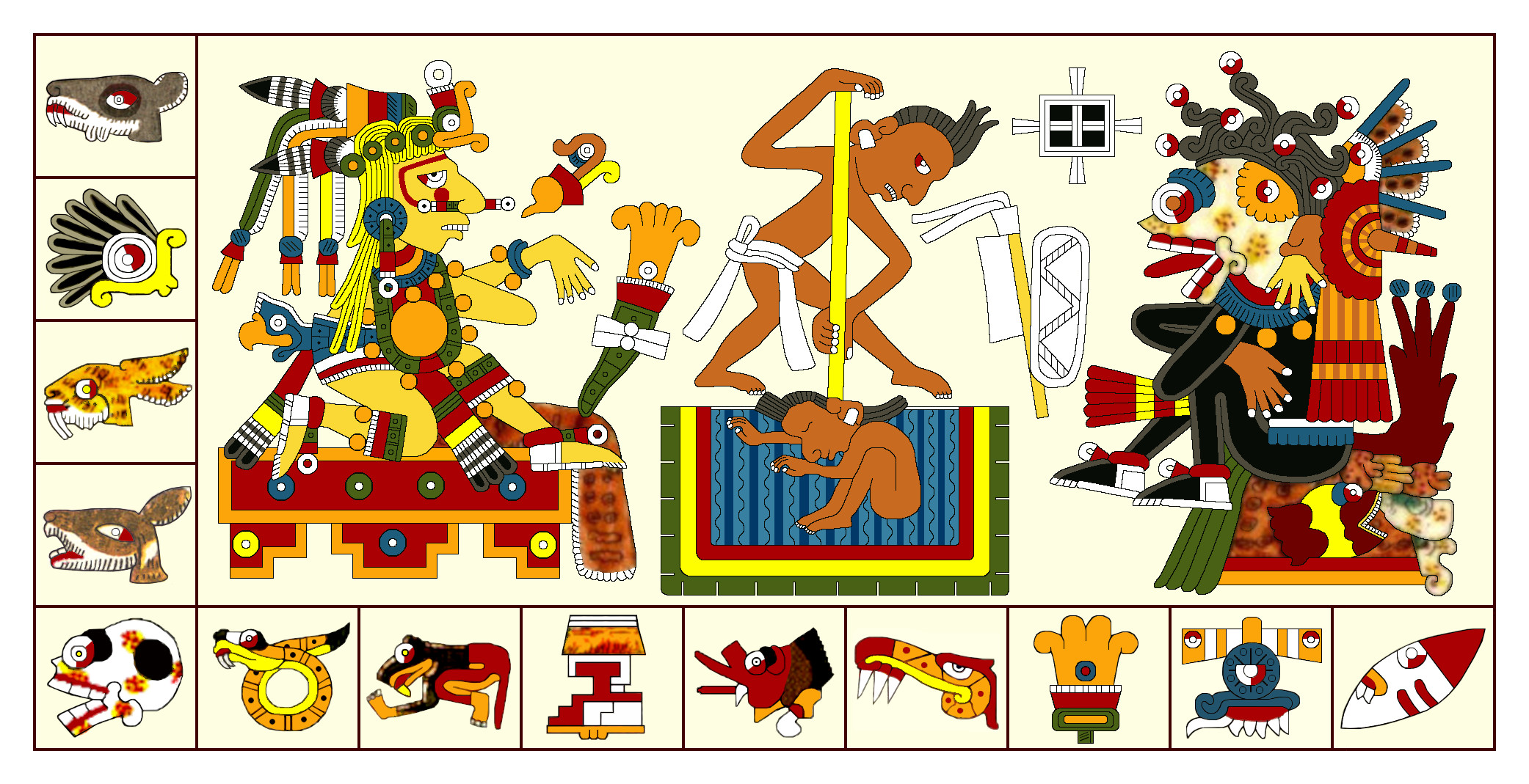 The square would seem to be another patolli board, and the ballcourt design in the upper left is a new emblem, reflecting Xochiquetzal’s additional patronage (along with Xochipilli’s) of the sacred ballgame tlachtli. The decapitated individual may indicate the traditional fate of losers at tlachtli. (I’m not aware of her predilection for that style of sacrifice otherwise. However, somewhere long ago I read of a ritual sacrifice to her of a female, the victim’s flayed skin being donned by her priestess. Oh, my, the wild and crazy things goddesses do in the privacy of their temples…)