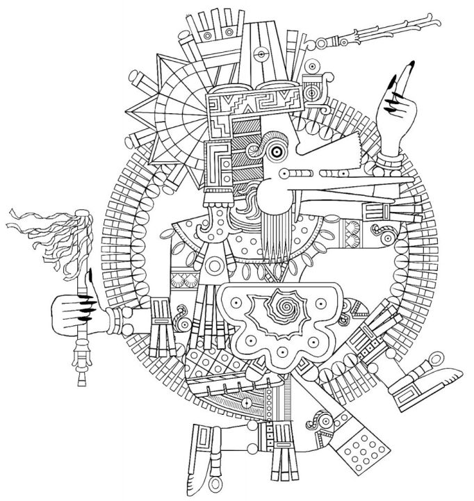The Aztec deities are a fascinating crowd of inter-related personalities involved in a soap-opera mythology of creation/destruction, love/strife, and life/death that makes the gods of Olympus look like wimps. Perhaps the confusing dramas, frequent aliases, and surreal images are due to the fact that the Aztecs and their deities indulged in psychoactive drugs like alcoholic pulque, peyote, hallucinogenic mushrooms, and other psychedelic herbs. So hold on to your hats for some challenging images to color, such as the current posting above.