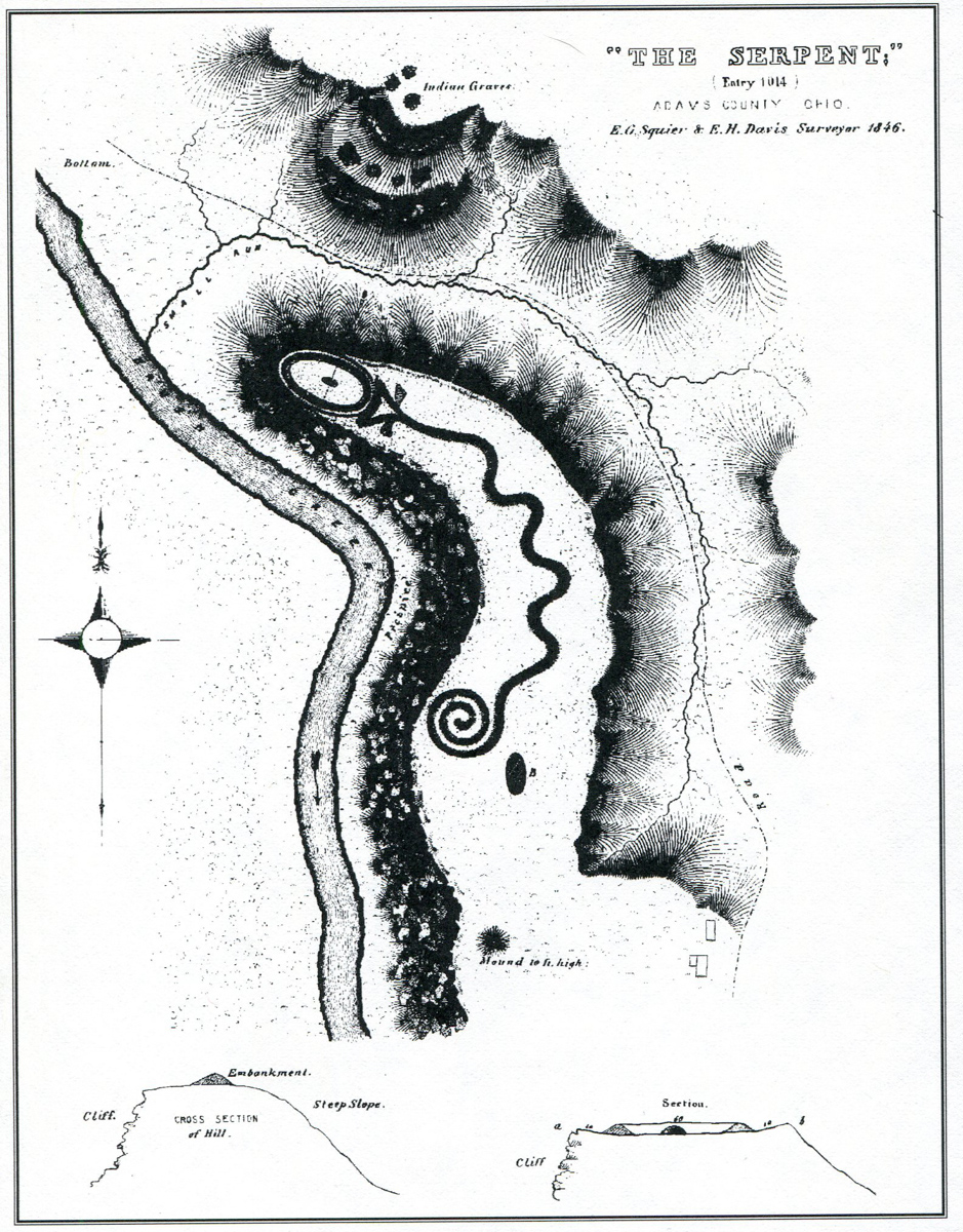Serpent Mound. The most famous earthwork in the Americas, the Serpent Mound in Adams County, Ohio, lies on a high spur of land and is some 1,400 ft. in length and 4-5 feet high and probably dates 100 BC – 100 AD. The survey shows triangular elevations near the head which have not been noted in later renderings and may suggest a plumed serpent. It is now a State Memorial and has been somewhat altered.